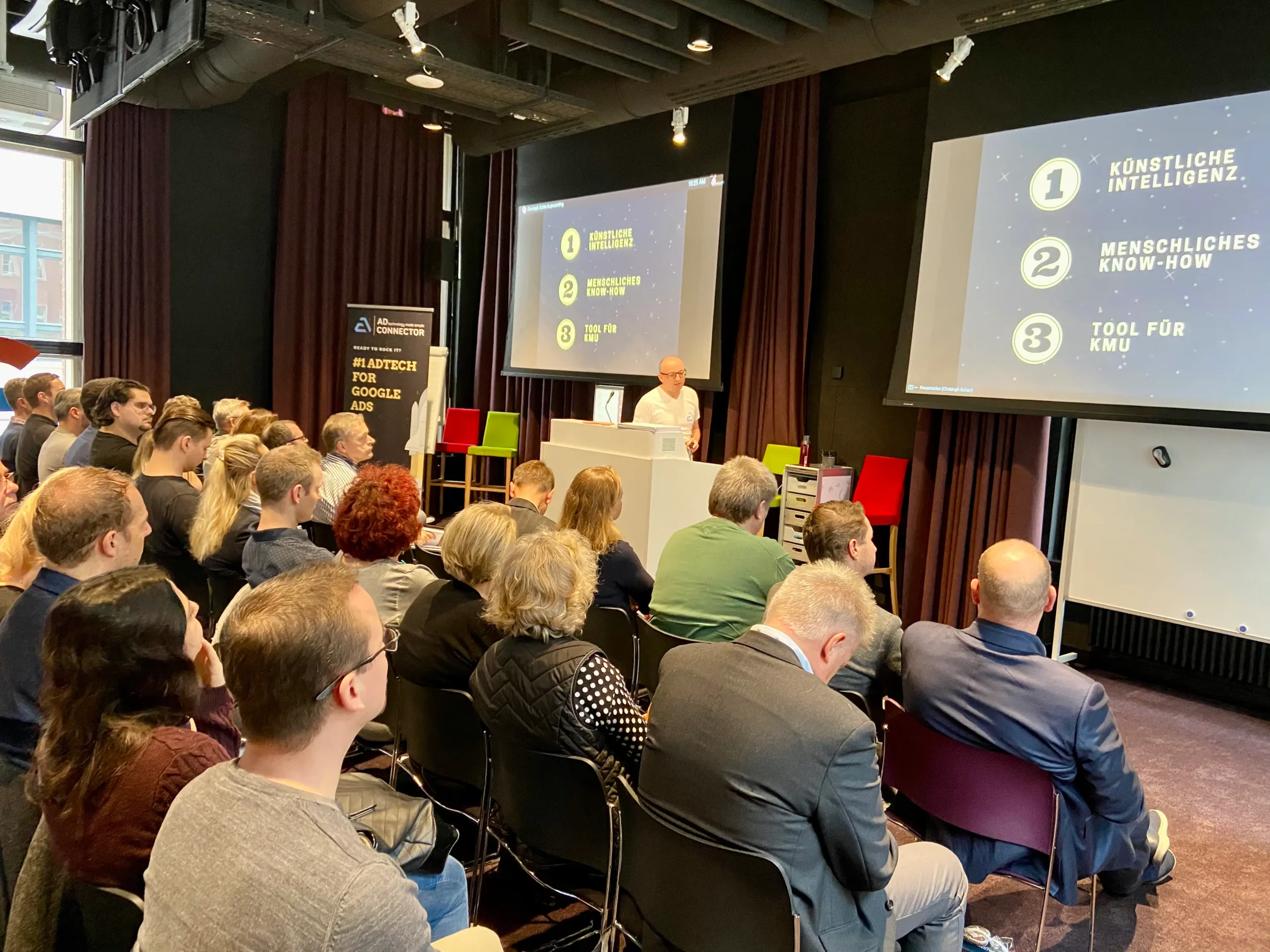 Erfolgreiche KI braucht mehr als nur einen Algorithmus – sie braucht Strategie. Wie Robert Buttgereit hier bei einem Google-Event (Bild unten) erläutert, basiert AdConnector auf drei unumstößlichen Säulen: modernster Künstlicher Intelligenz, tiefem menschlichem Know-how und einer kompromisslosen Ausrichtung auf die Bedürfnisse von KMU.